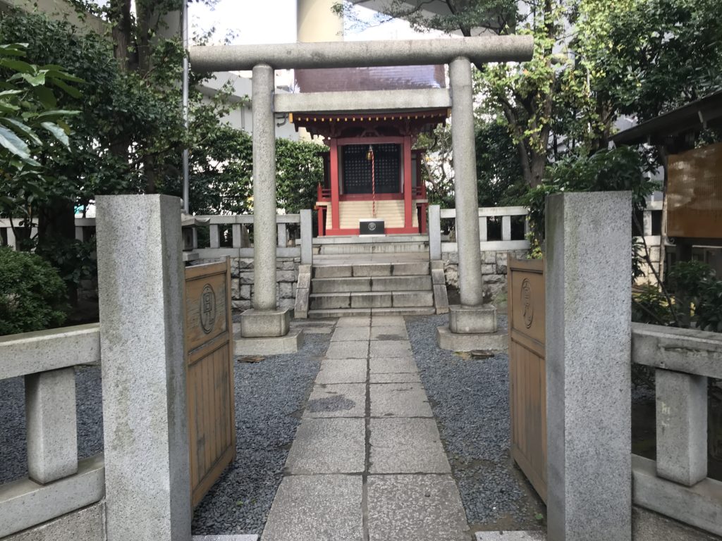 東京証券取引所本館の北、歩いて1分、道路を挟んで日本橋川の辺にある小さな神社(日本橋兜町1-8)。